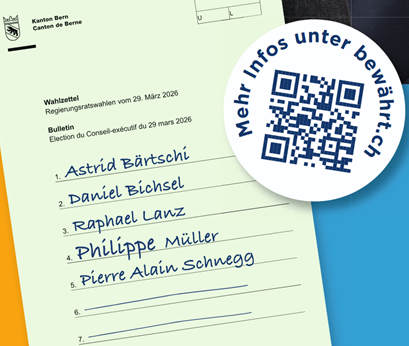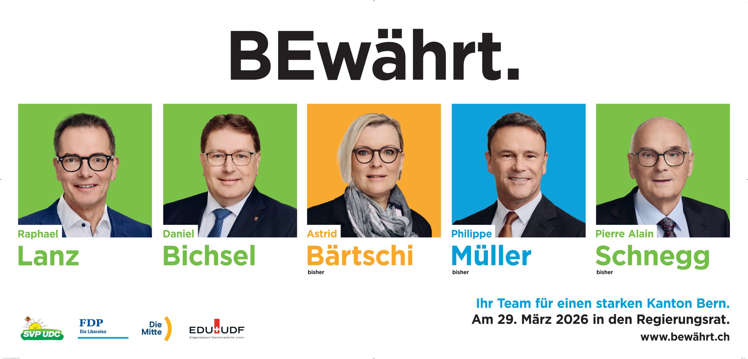 Die bürgerlichen Parteien SVP, FDP, Mitte und EDU spannen für die Regierungsratswahlen zusammen und haben ein Fünfer-Päckli geschnürt, welches aus den drei Bisherigen Pierre Alain Schnegg (SVP), Astrid Bärtschi (Mitte) und Philippe Müller (FDP) sowie aus den neu antretenden Christoph Lanz (SVP) und Daniel Bichsel (SVP) besteht. Die fünf Kandidierenden treten unter dem Motto „BEwährt“ an (Link auf die Website).